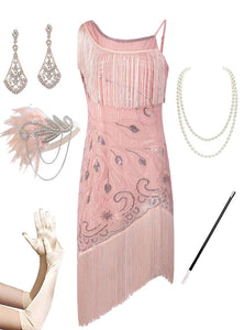 Pink Sweet Gatsby Glitter Fringe 1920s Flapper Dress Set