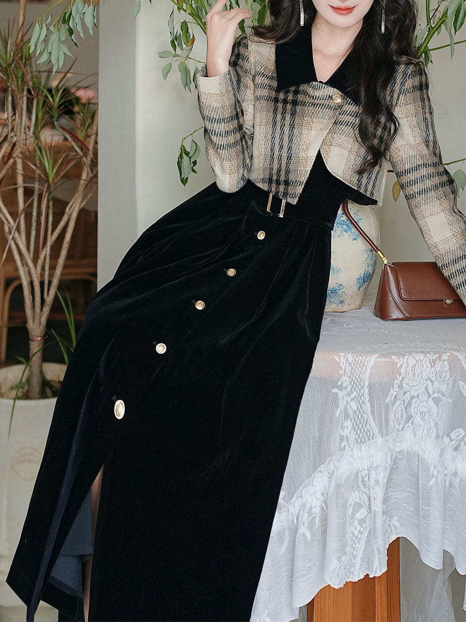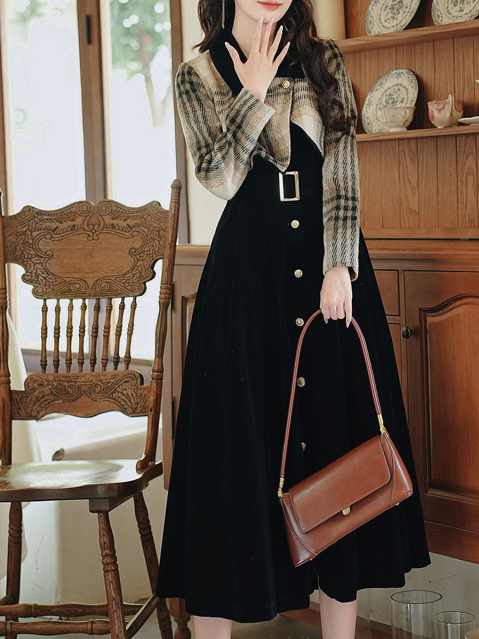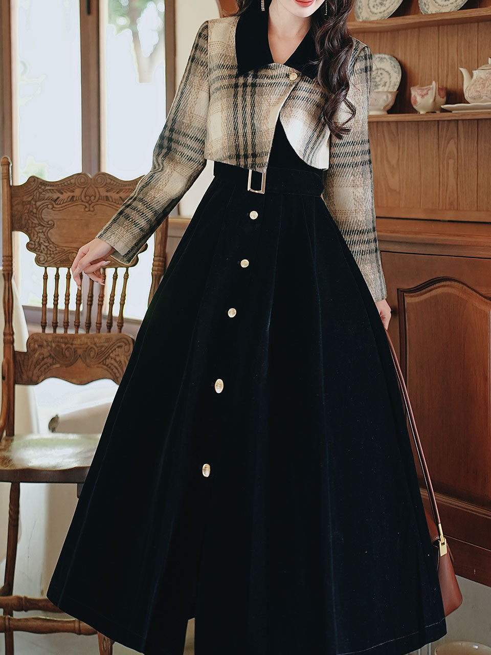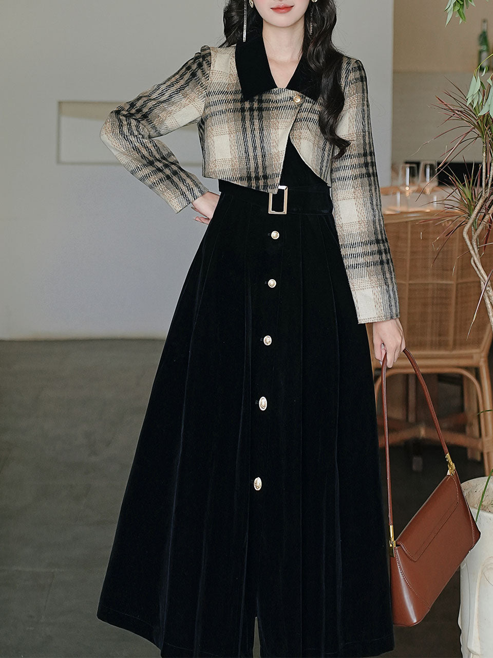 25% OFF Black Plaid Tweed Fake Two-Piece Long Sleeve Vintage Dress