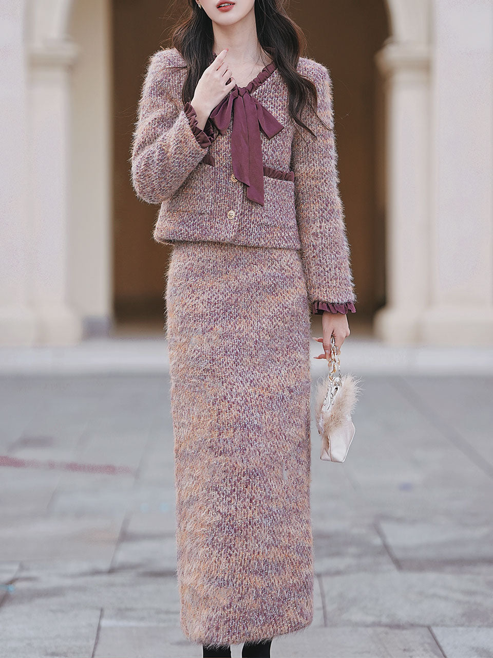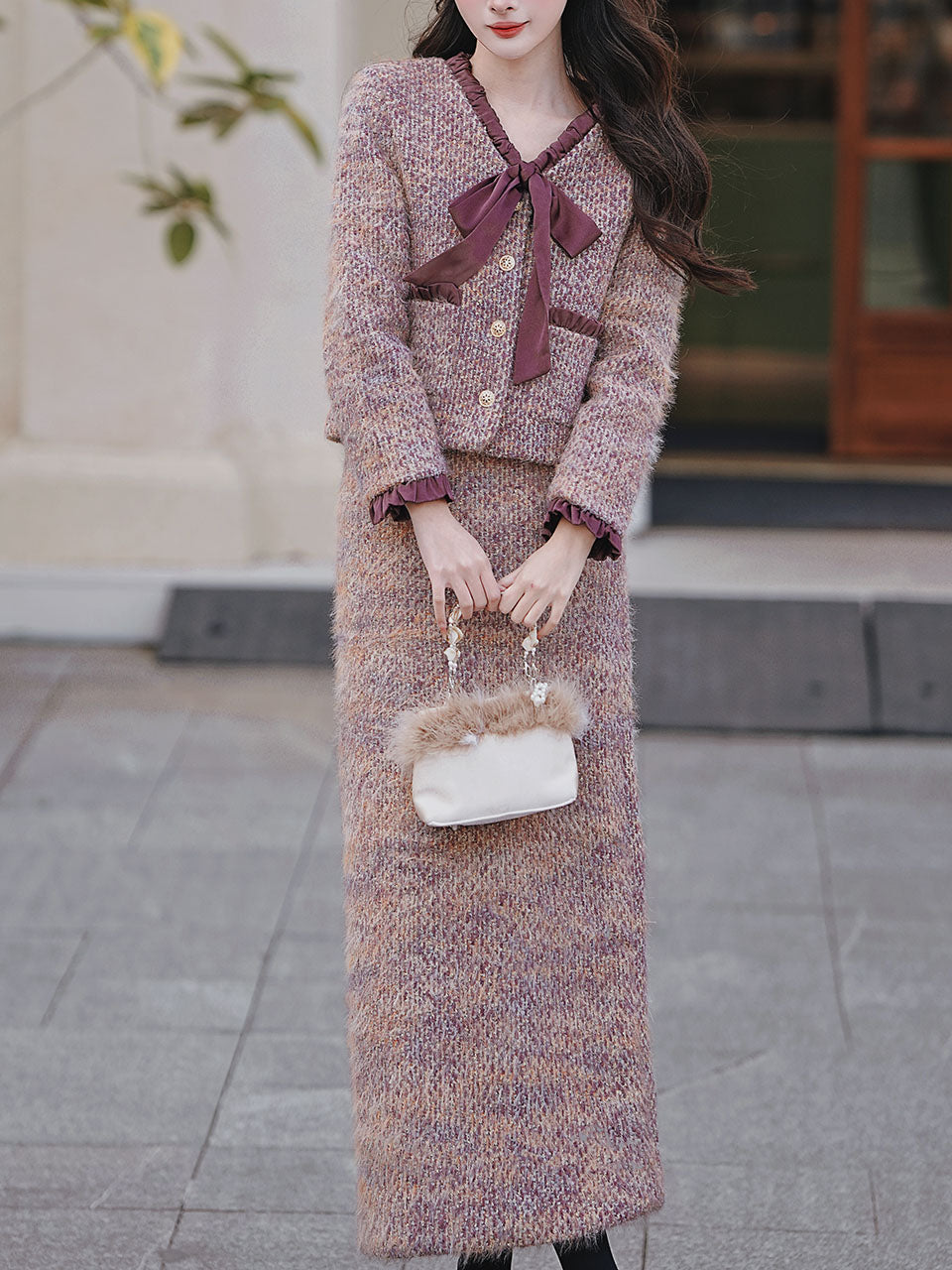 26% OFF 2PS Purple Bow Tweed Warm Coat With Skirt 1950S Vintage Set