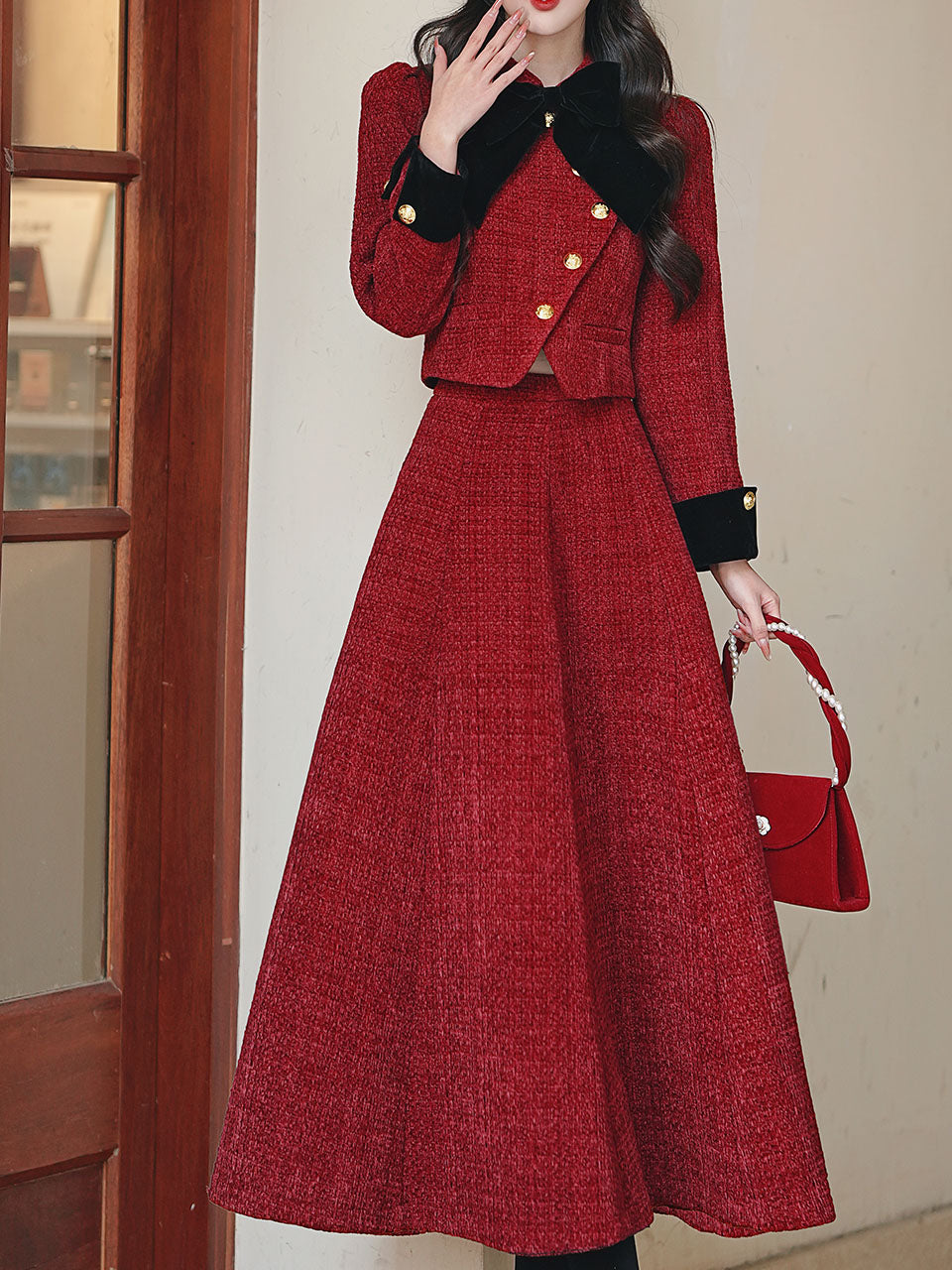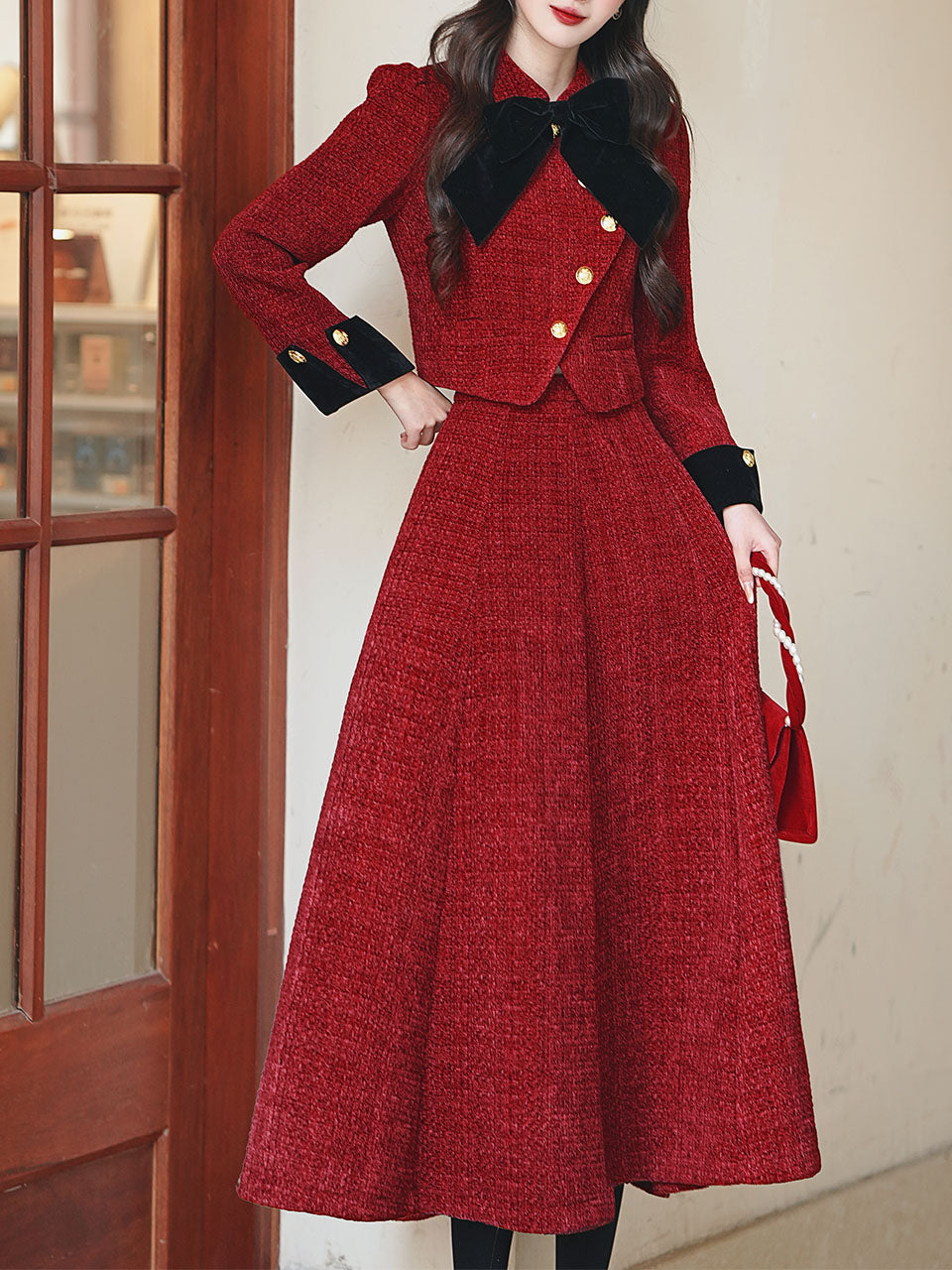 2PS Red Bow Tweed Warm Coat With Swing Skirt 1950S Vintage Audrey Hepburn's Style Outfits