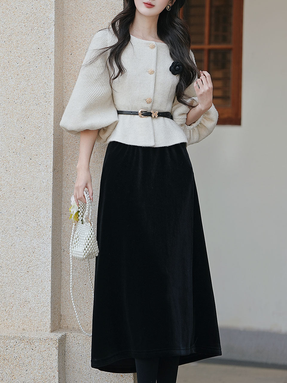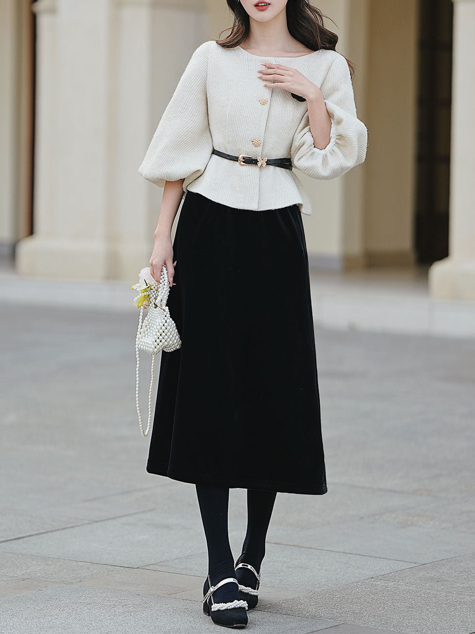 2PS White Crew Neck Tweed Warm Coat With Black Swing Skirt 1950S Vintage Audrey Hepburn's Style Outfits