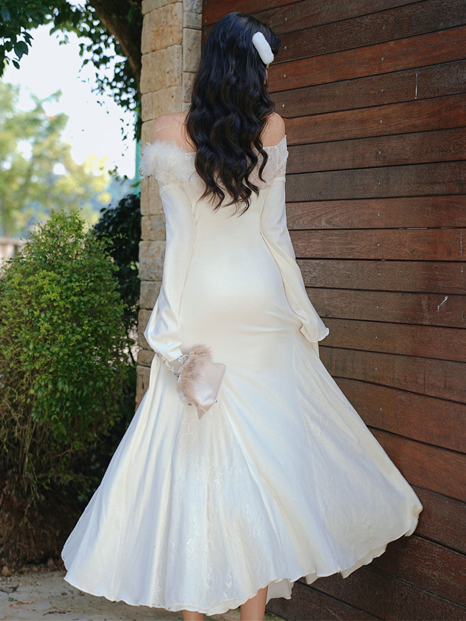 White Lace Ruffle Sleeve Sequined Fishtail Wedding Dress