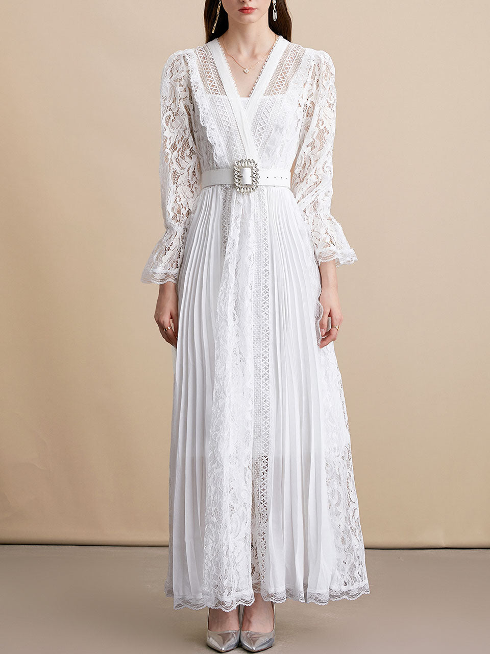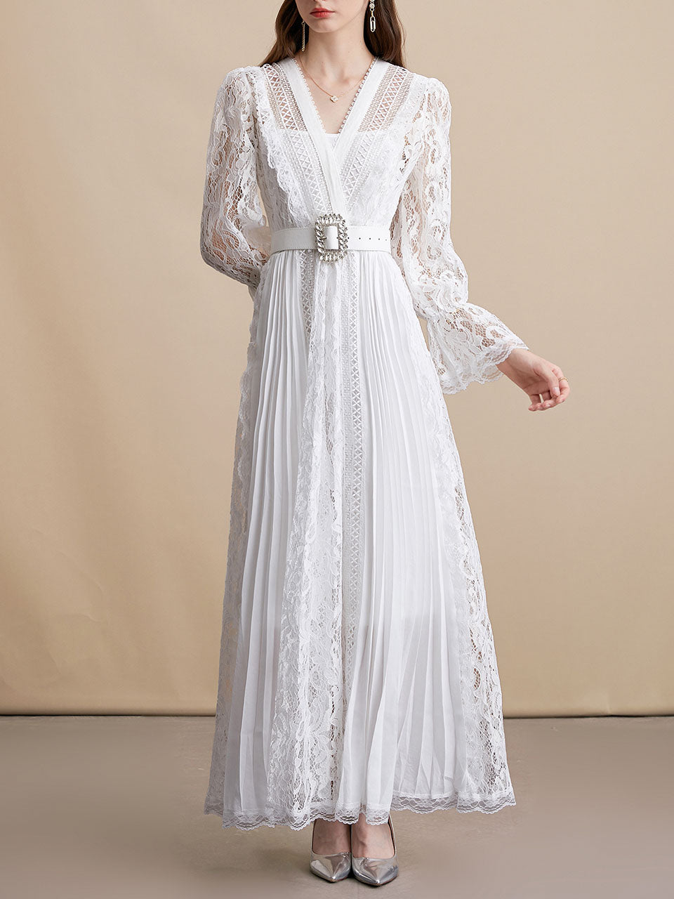 White V Neck Long Sleeve Classic 1950S Vintage Lace Dress