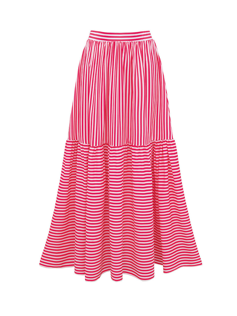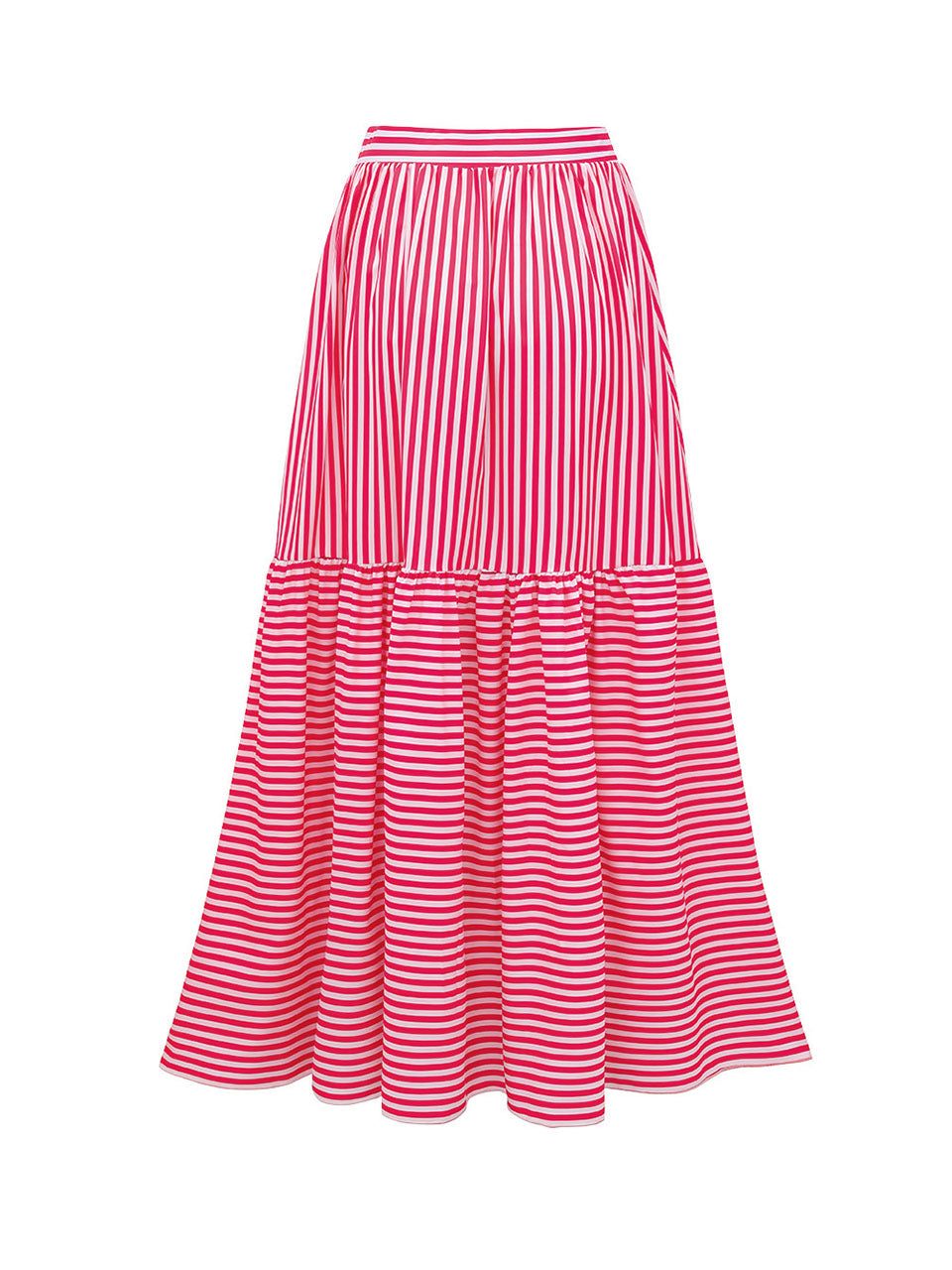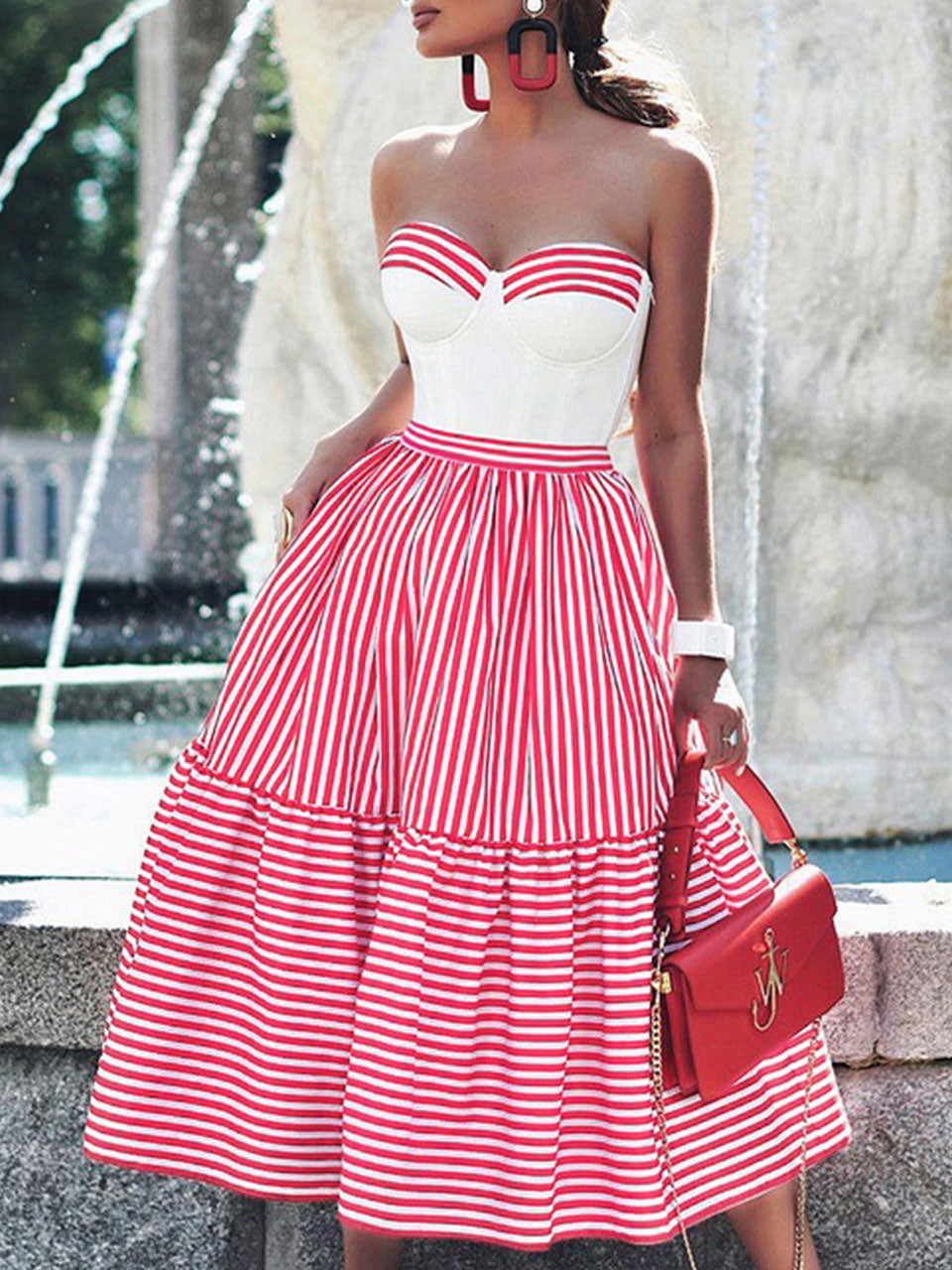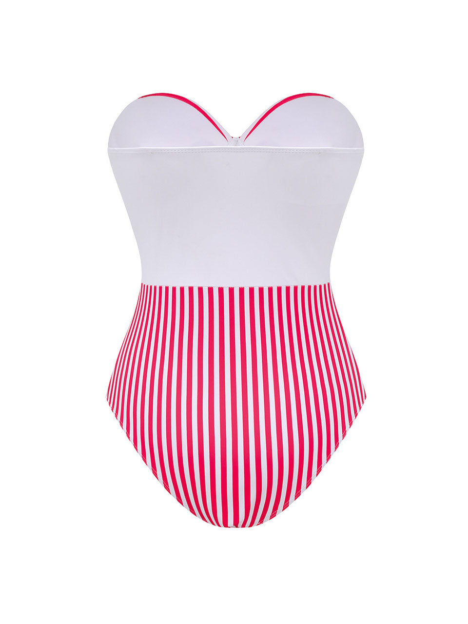 Pink and White Vertical Striped Bandeau One-Piece Swimsuit with Bathing Suit Skirt