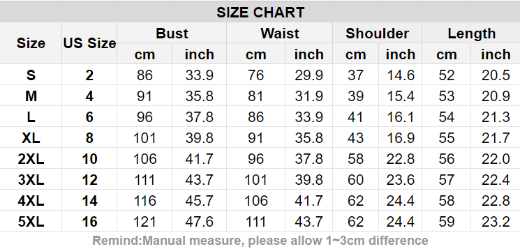 Size: There are 8 sizes (S/M/L/XL/2XL/3XL/4XL/5XL) available. Please allow 1-2cm differs due to manual measurement. Thanks for understanding! (All measurement in cm and please note 1cm=0.39inch)