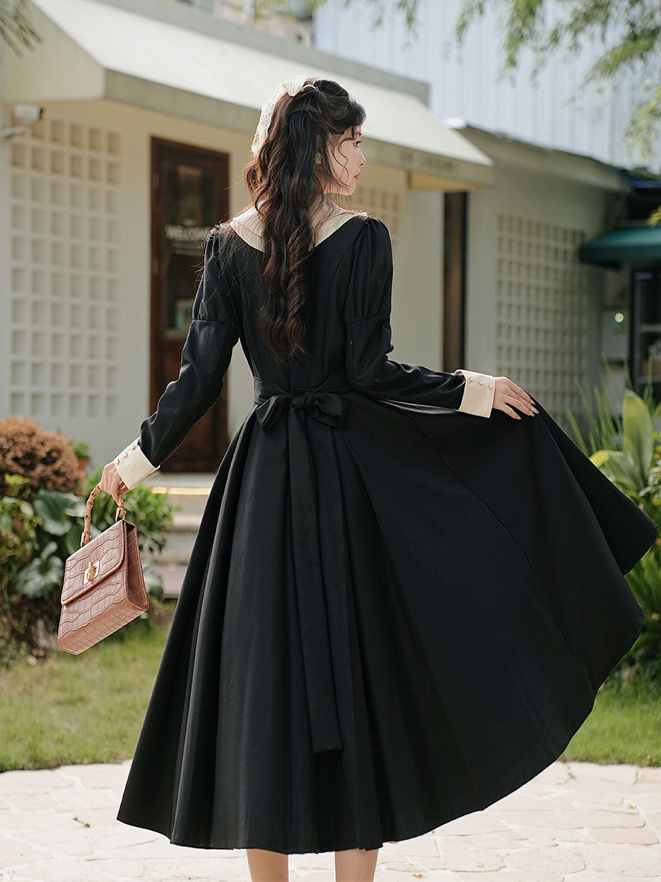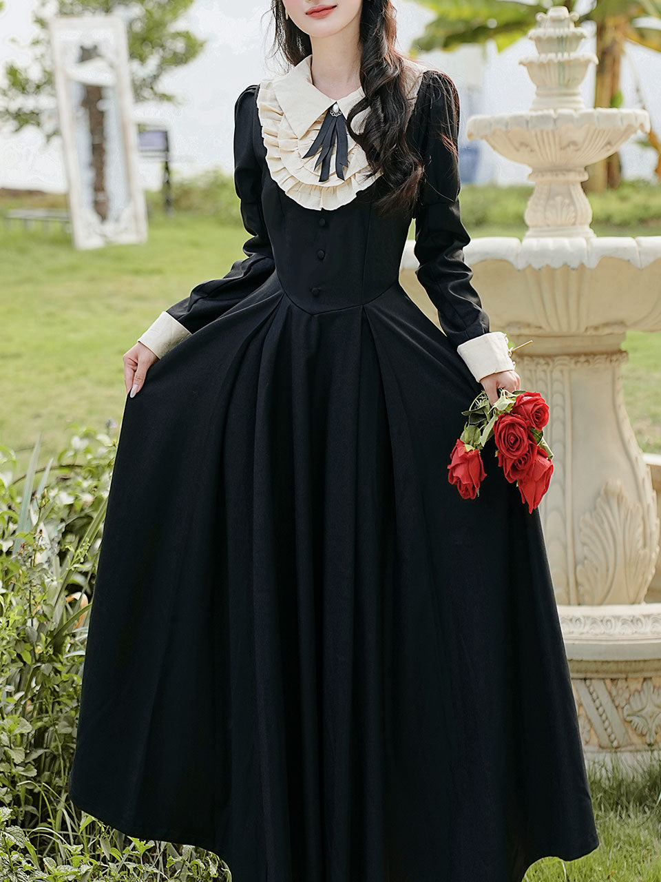 White Lace Collar Long Sleeve Black Edwardian Revival Dress