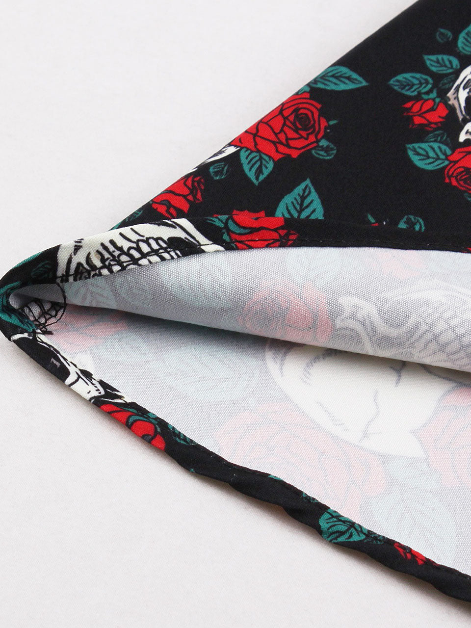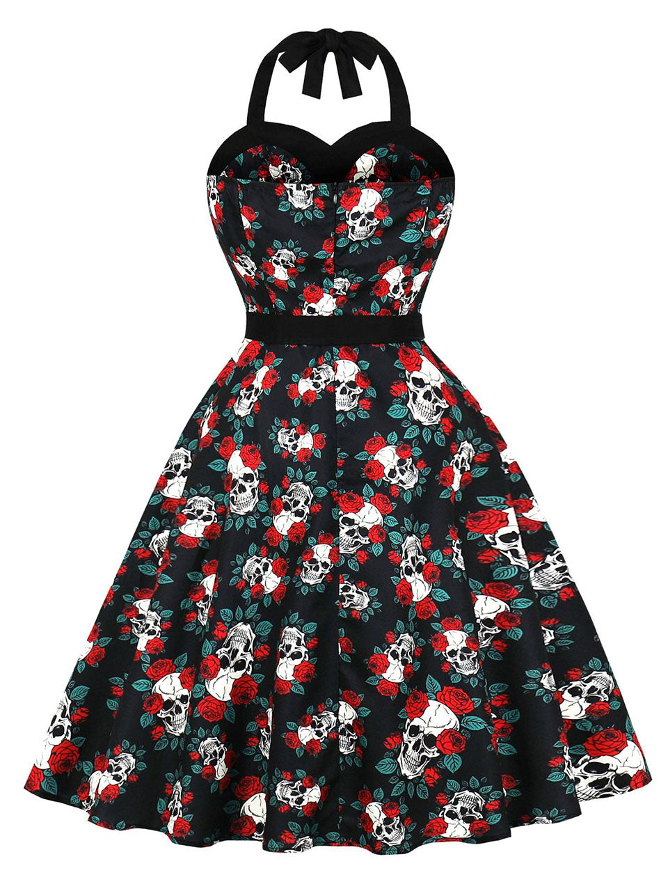 Gothic Black Skull and Rose Print Halter Vintage Halloween Dress