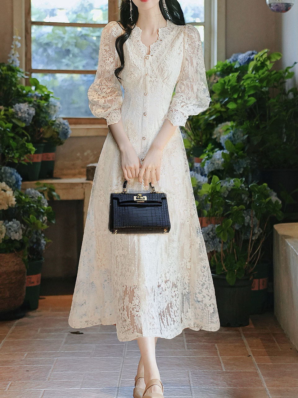 White V-Neck Long Sleeve Lace Vintage Wedding Dress